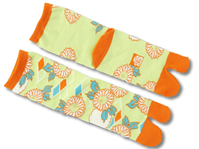 Pour les amatrices d'ambiances printanières, ces chaussettes japonaises devraient être un ravissement : un fond vert léger, plein de fraîcheur, agrémenté de fleurs de chrysanthème et de motifs géométriques discrets.