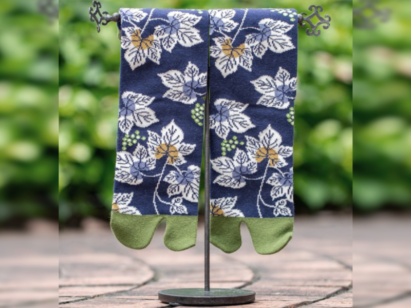 Si vous voulez changer des sakura tellement tendance au Japon, pourquoi ne pas choisir un modèle de chaussettes japonaises décorées de feuilles de vignes dans une ambiance très sobre d'un bleu-gris assez passe-partout ?