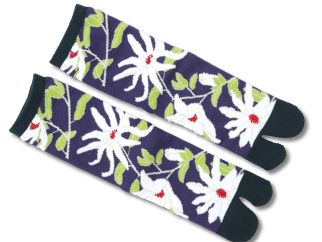 Envie de chaussettes japonaises à la déco florale sortant des sempiternelles fleurs de cerisier ? Voici de superbes magnolias de Kobe dont la blancheur contrastera avec un beau fond indigo.