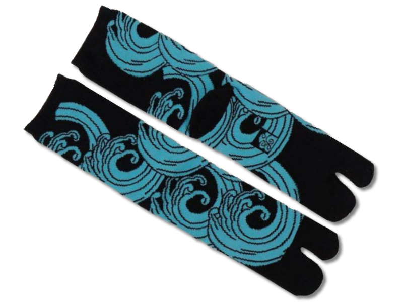Voici un modèle de chaussette à doigt dont la déco restera très sobre avec un fond noir mettant en valeur une simple vague d'un beau turquoise, non sans rappeler celle représentée par Hokusai sur sa plus fameuse estampe !