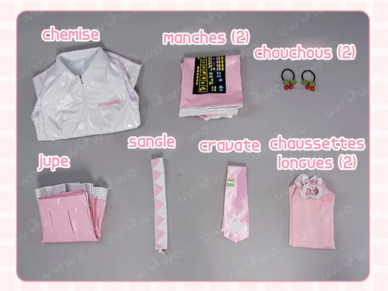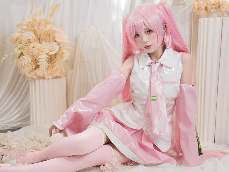 Avis aux fans de Vocaloid, admirez ce superbe cosplay de Sakura Miku, la version "pinky" de la star Hatsune Miku. Tout y est : la tenue bien sur, mais aussi les bas et les manches si typiques de la chanteuse virtuelle, et même les chouchous en forme de cerise que vous pourrez installer sur votre perruque.