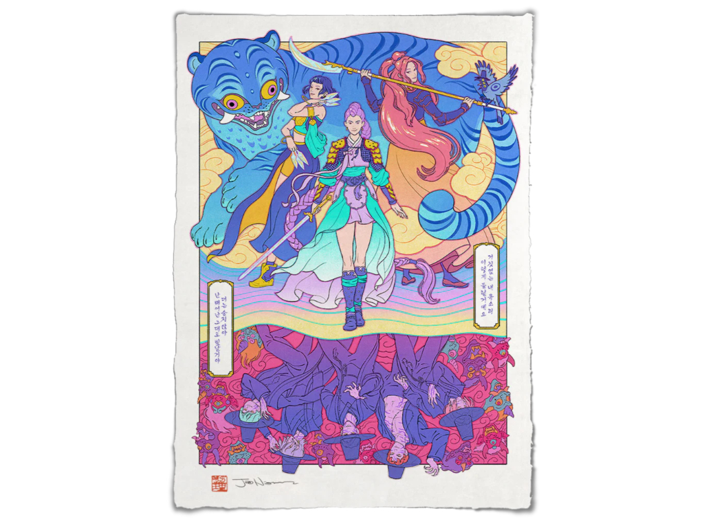 Connaissez-vous les K-Pop Demon Hunters ? Ce manga permet d'aborder avec brio des thèmes du dépassement de la honte et de l'apprentissage du pardon envers soi-même. Pour cette création, Jed Henry a souhaité rendre hommage à l'art traditionnel coréen tout en faisant un clin d'œil à l'esthétique résolument moderne de HUNTR/X. On y trouve des éléments d'armure coréenne, des détails inspirés du *hanbok*, ainsi que des références au style vestimentaire contemporain des jeunes femmes. Le résultat final s'apparente à une sorte de fusion fantaisiste avec un très beau rendu.