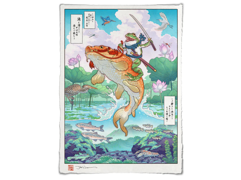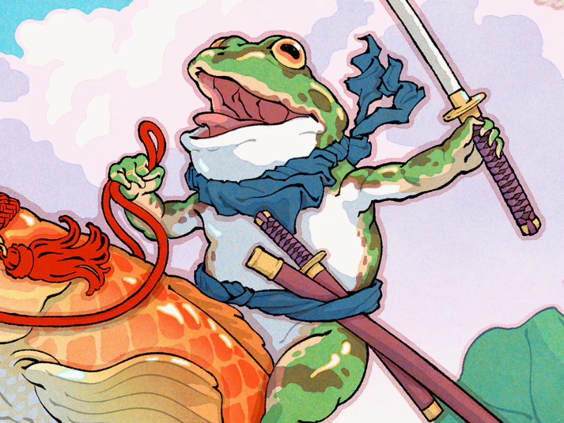 Faites la connaissance du Lord Gero, noble grenouille samouraï qui affronte ses ennemis en chevauchant une superbe carpe koï.