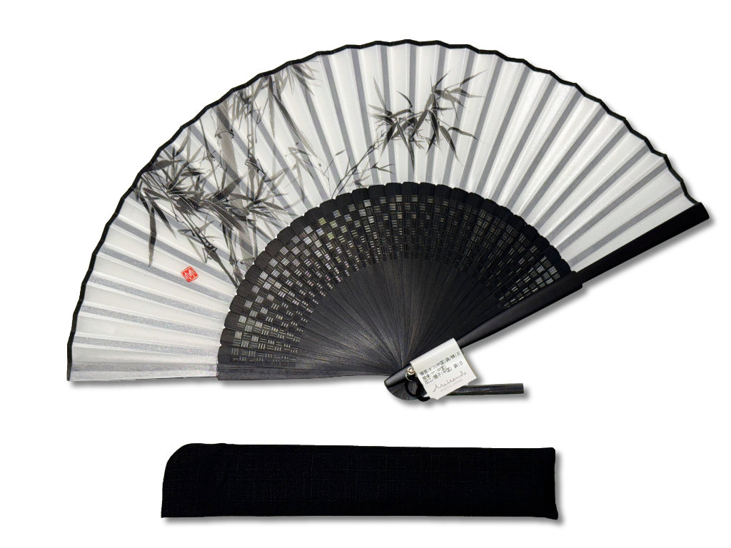 Retrouvez l'ambiance appaisante des kakejiku sansui à travers cet éventail décoré de bambous peints suivant la technique du sumi-e.