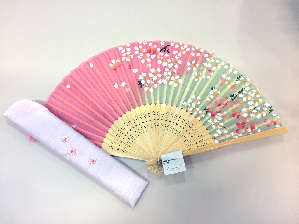 Eventail en tissu bicolore décoré de fleurs de cerisier (sakura en japonais) à la fois très esthétiques et discrètes.