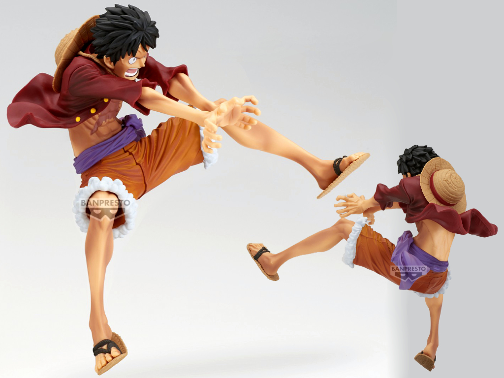 Cette figurine dynamique capture le héro de One Piece, Monkey D. Luffy en pleine action, avec ses bras tendus et ses jambes écartées, prêt à lancer une attaque emblématique.