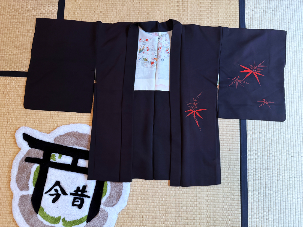 Haori en soie seconde main - noir déco bambous rouges