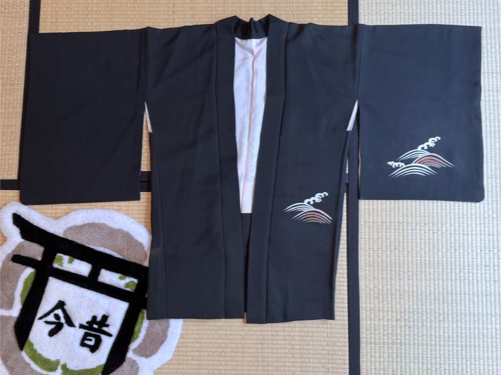 Haori en soie seconde main - noir déco oiseaux sur un nuage