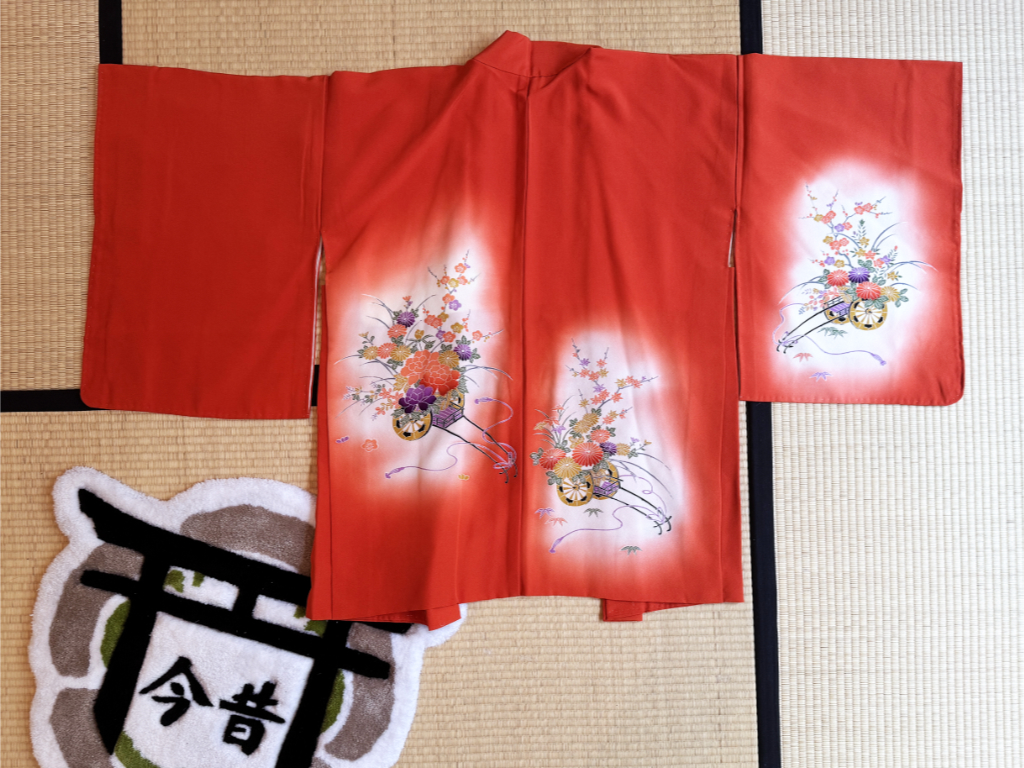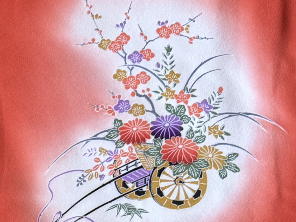 Haori en soie seconde main - orange avec déco d'un bouquet de fleurs