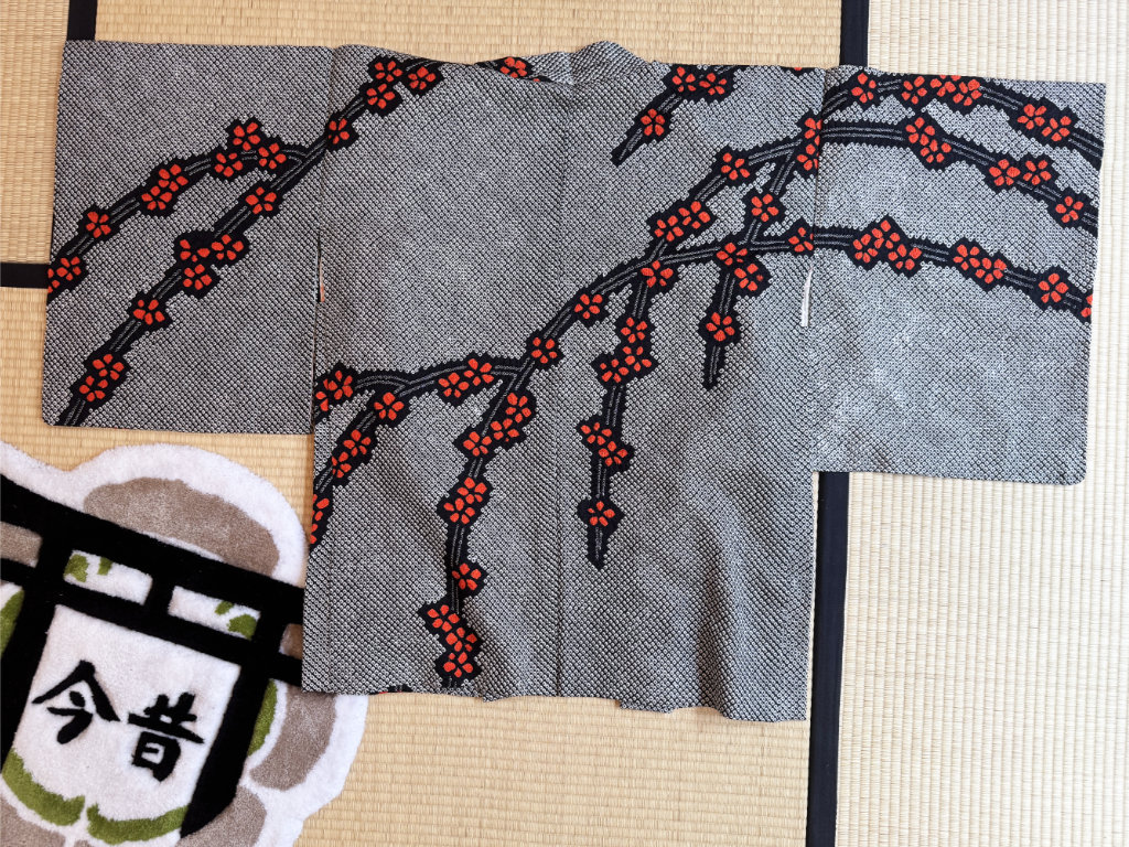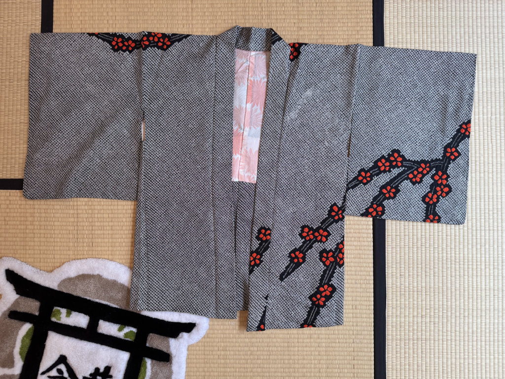Haori en soie seconde main - shibori gris déco branche de prunier
