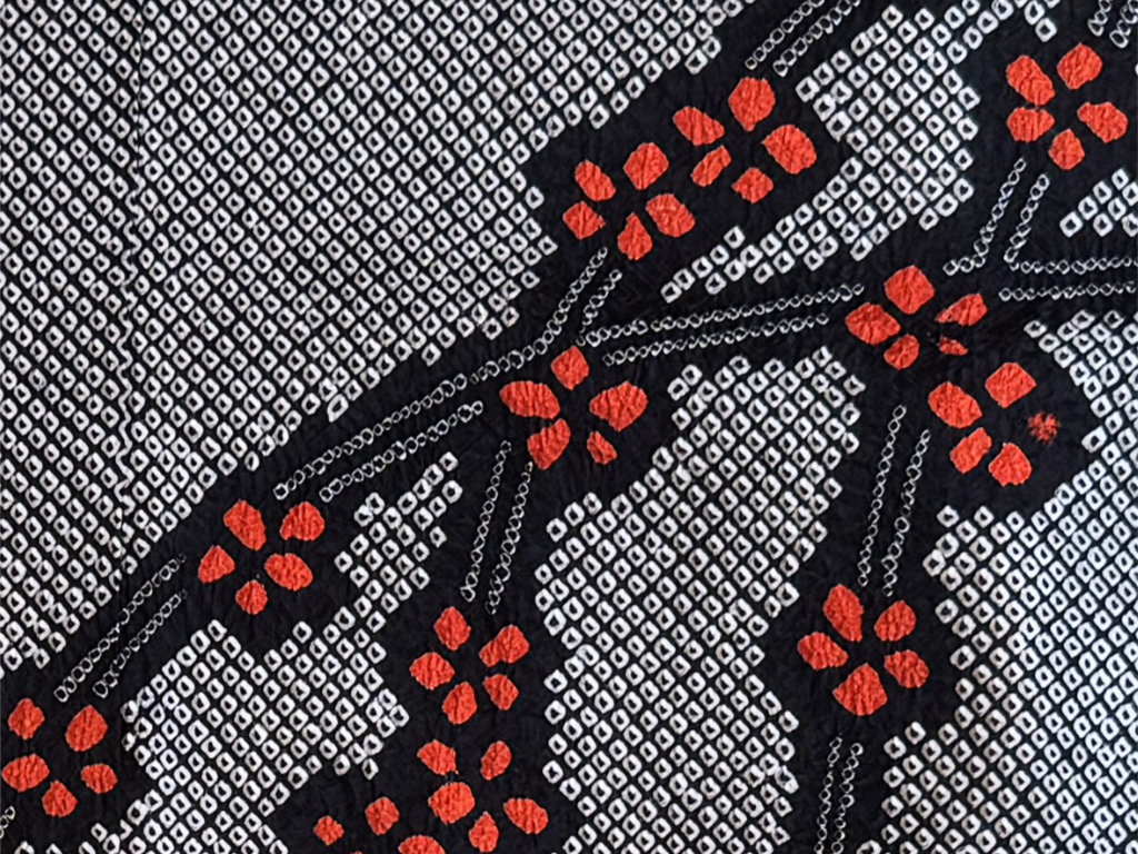 Celui-ci est décoré de très beaux "shibori", cette technique de teinture qui consiste à coudre de petites zones avant teinture pour ensuite les libérer, créant à la fois le motif par alternance de blanc et de la couleur de teinture d'une part, mais aussi un effet de volume d'une grande finesse.