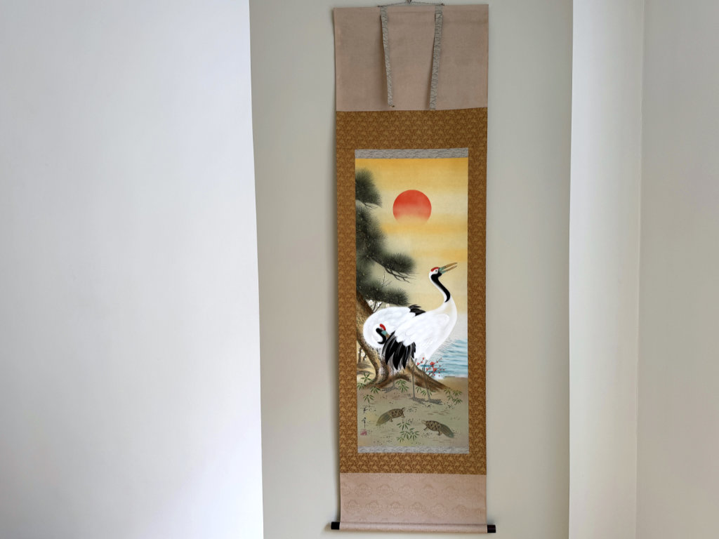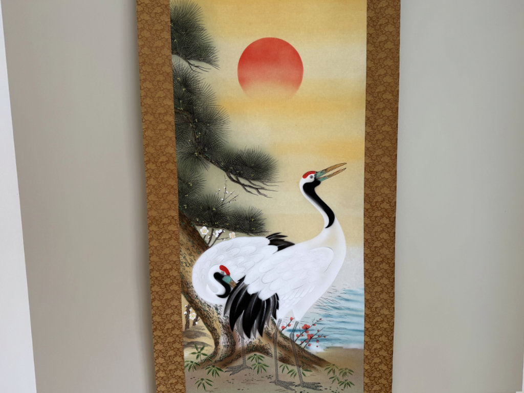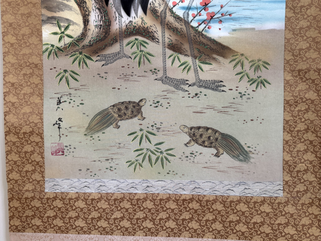Il représente deux grues japonaises tandis que le soleil se lève, avec à leur pieds deux tortues.