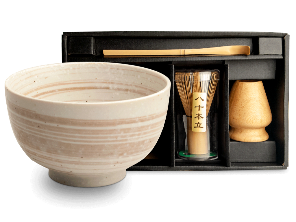 Ce set comprend non seulement un chawan, ou bol à matcha, en céramique Minoyaki, mais également un chasen (fouet) en bambou, un support à chasen et une chasaku (cuiller à doser)
